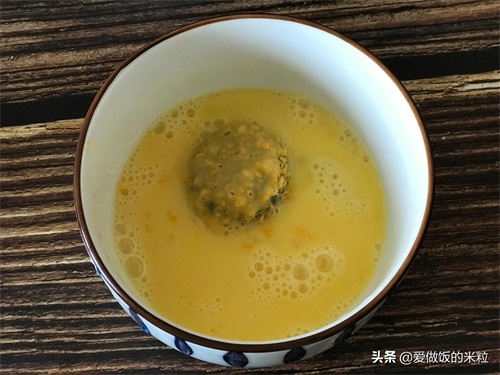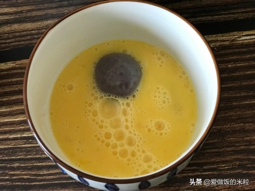 ⑥、拿起一个汤圆,先蘸一下蛋液。