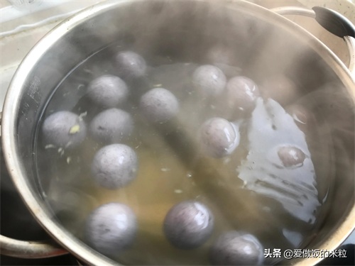 ②、起锅烧水,把水烧开以后,下入汤圆。用铲子轻轻推动汤圆,防止粘锅。盖上锅盖,煮至汤圆全部飘起来,这时候汤圆已经基本上八成熟了,煮到这里就可以了。