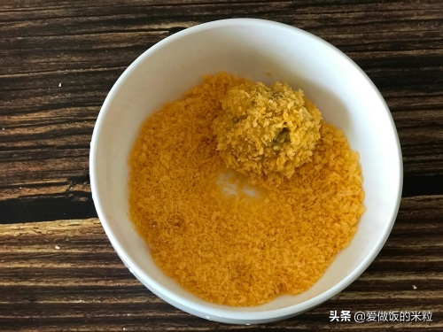 把汤圆全部蘸好面包糠以后放在盘子中静置一会儿。让面包糠牢牢地粘在汤圆上,防止下锅炸的时候面包糠掉渣。