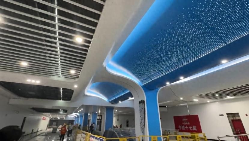 在2号线的装修风格上做了大量的减法,整个体现出简约而不简单的风格。大范围裸露了天花板,这样大幅度降低了我们投资建设成本,便于后期的施工和运维,同时将整个车站的空间尽量做高,给乘客提供良好的乘车体验感觉。