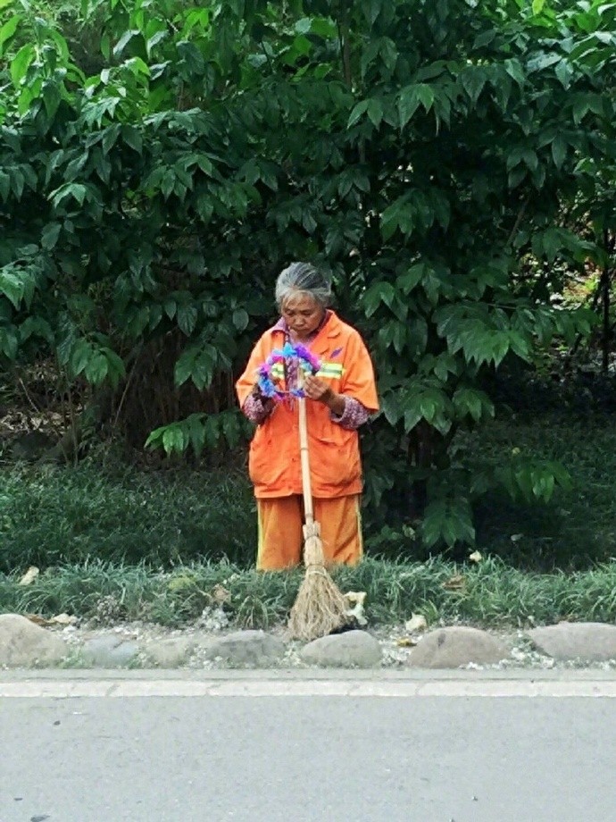 第三个:一个花环让奶奶看了好久,或许她正在回忆她的小时候吧。