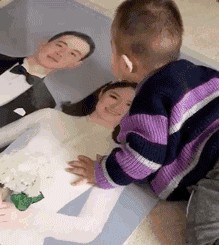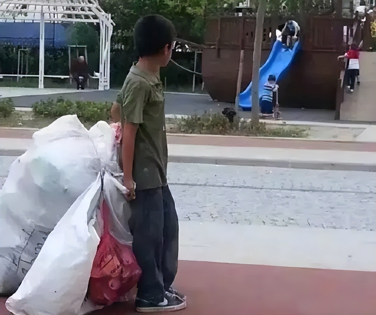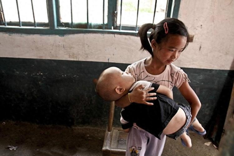 第十六个:一个小女孩儿,她想上学,又不能不看弟弟,没办法,只能抱着弟弟来上学。