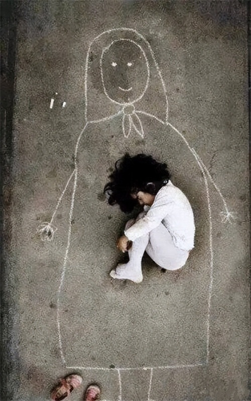 第四个:从小就失去妈妈的孩子,看到别人都有妈妈抱很羡慕,于是自己给自己画了个妈妈,小心翼翼的脱下鞋子在“妈妈”的怀里睡着了。