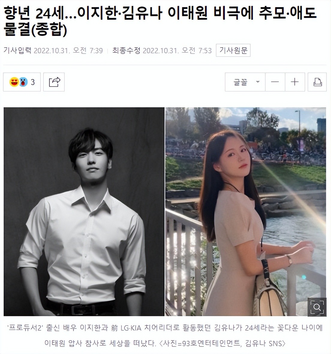 而这已经不是第一位在踩踏事故中遇难的韩国艺人,就在她之前,韩国一位“帅气欧巴”李智汉,也被报道丧生在这场灾祸中,两人同岁,都是24岁。