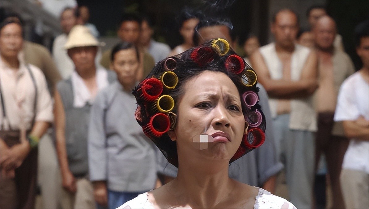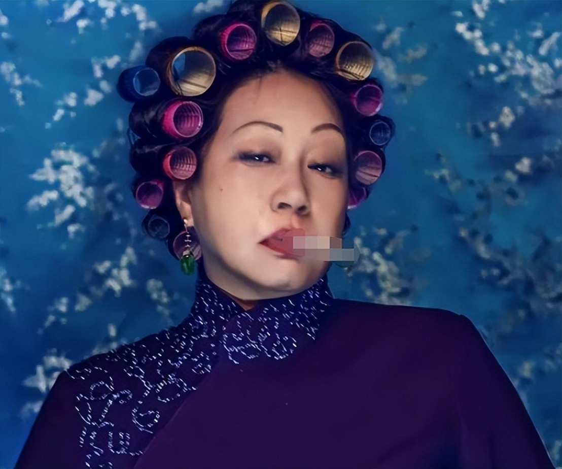 头上烫着卷发,身穿宽松睡衣,嘴里叼着一根烟,满脸凶煞。