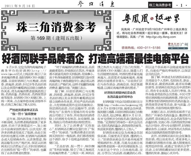 2011年09月15日,报道:好酒网联手品牌酒企 打造高端酒最佳电商平台
