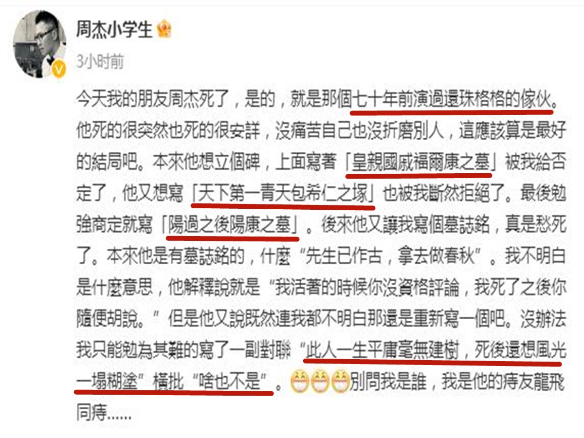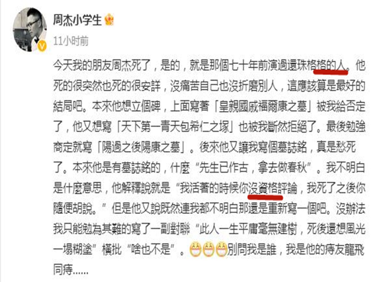 网友们对周杰的“讣告”解读各异,有人认为这是他对不公评论的无声反抗,也有人认为这是他对“尔康”角色的告别和释怀。