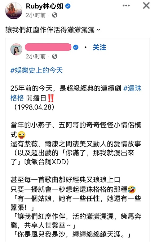 2023年林心如在社交媒体上转发了当年剧照,配以剧中歌词“让我们红尘作伴过得潇潇洒洒”,看似平常的举动却引发了网友们的热议!