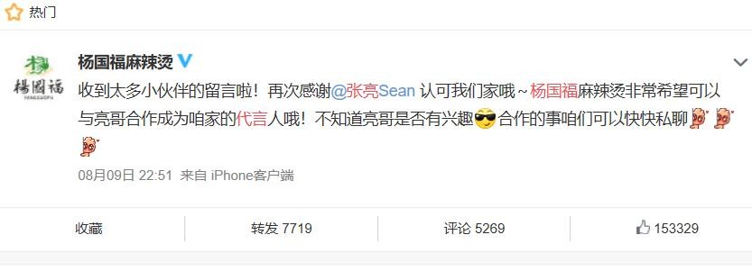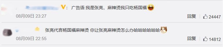杨国福与张亮本无缘,全靠无脑网友一线牵!随后杨国福麻辣烫在线喊话张亮,想邀请他做代言人,评论里网友们众说纷纭,脑洞大的网友把张亮的代言词都想好了。比如:我张亮麻辣烫只吃杨国福。再比如:杨国福,张亮都说好吃!还有网友表示张亮麻辣烫会不会找一个名字叫杨国福的代言呢?
