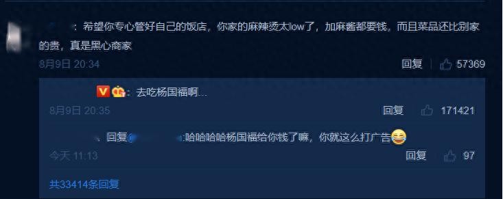 继张亮为赵丽颖扒拉菜事件发声后,有网友在下方评论:希望张亮能够管好自己家的麻辣烫,称麻辣烫太low了,加麻酱都要钱,简直是黑心商家。张亮回复:去吃杨国福!