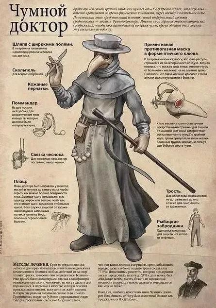 为了对抗黑死病,饱受瘟疫肆虐的小镇雇佣了医生,无论贫富,都能让镇民接受治疗。这些医生负责开处方(据说这些混合物具有保护作用,可以给鼠疫解毒)、见证遗嘱,以及尸检。由于黑死病具有强烈的传染性。医生便发明了鸟嘴这样的装扮。