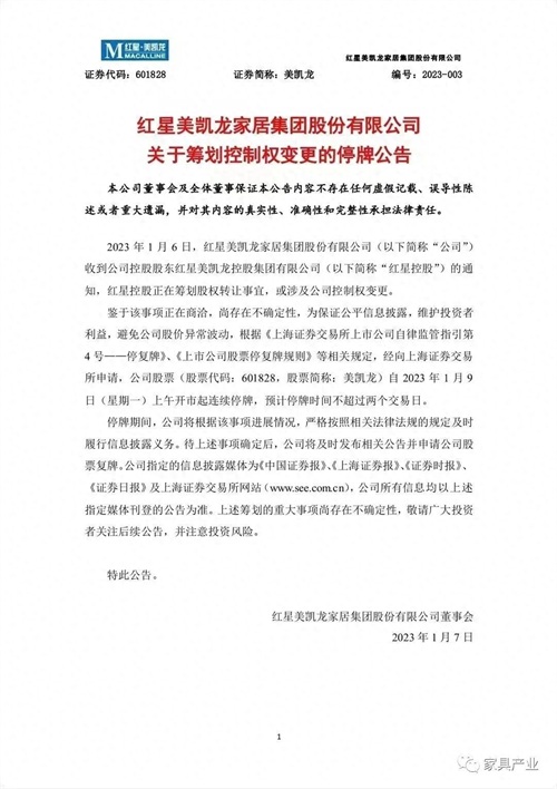 1月6日,红星美凯龙家居集团股份有限公司(以下简称“美凯龙”)发布关于筹划控制权变更的停牌公告显示,美凯龙收到公司控股股东红星美凯龙控股集团有限公司(以下简称“红星控股”)的通知,红星控股正在筹划股权转让事宜,或涉及公司控制权变更。