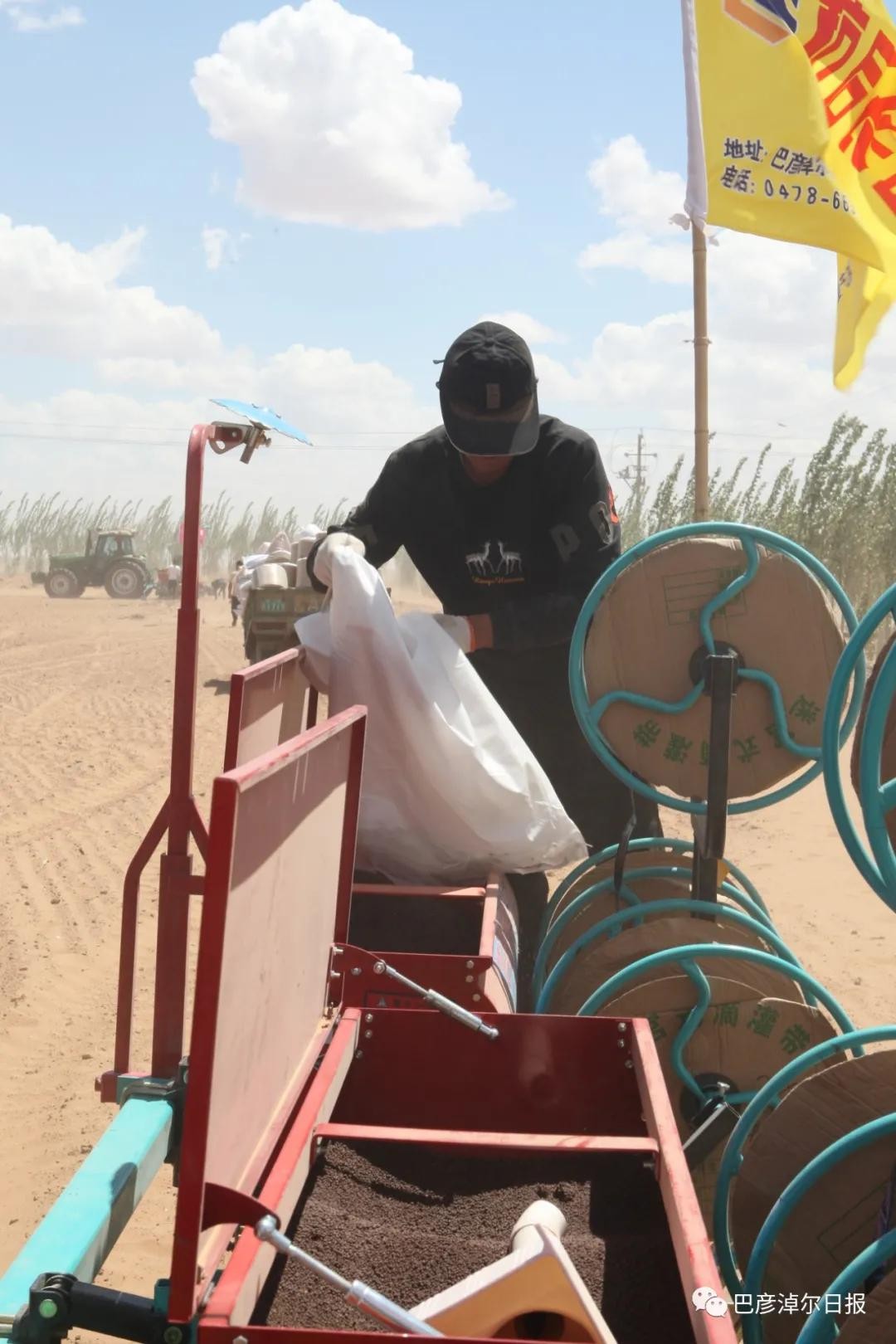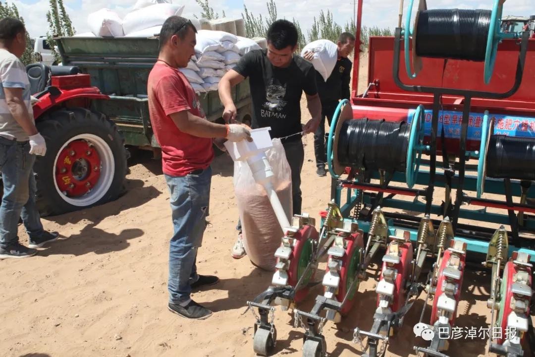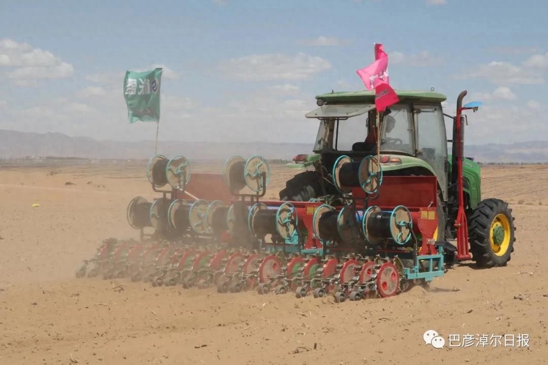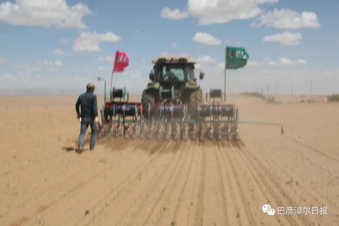 5月26日上午,磴口县沙金苏木巴音宝力格嘎查无垠的沙地上,3台大型播种机穿梭种植旱稻,埋压滴灌管、播种一次性完成。这是巴彦淖尔市首次试种旱稻。