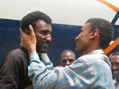 在苏丹喀土穆国际机场,被武装分子释放的平民与亲友团聚。