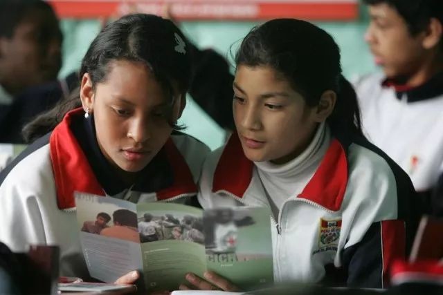 在秘鲁首都利马的一所小学里,学生们在参加探索人道法项目。