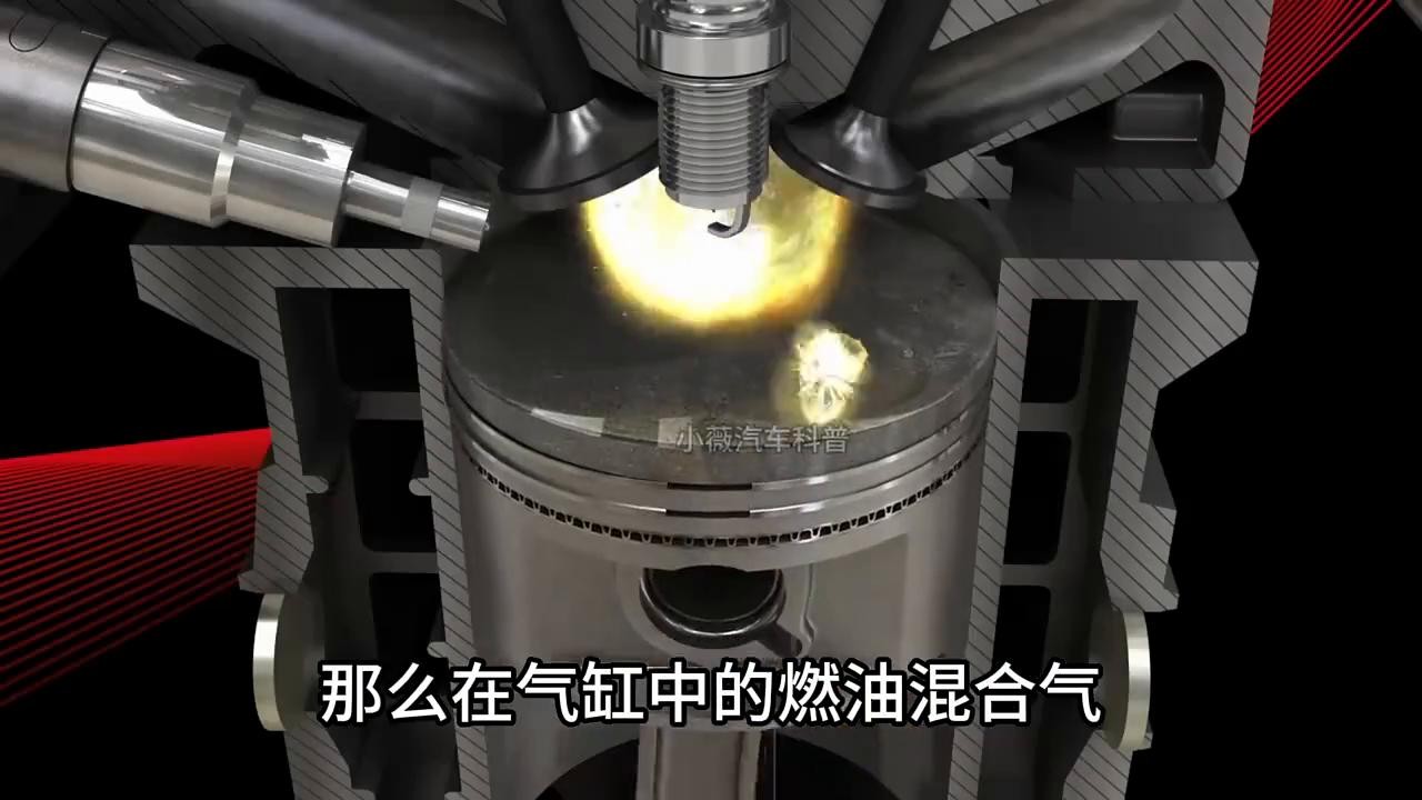 ·第三冲程做功气缸顶部的火花塞点火引燃气缸中的燃油混合气,爆燃产生的热量推力推动活塞向下运动。