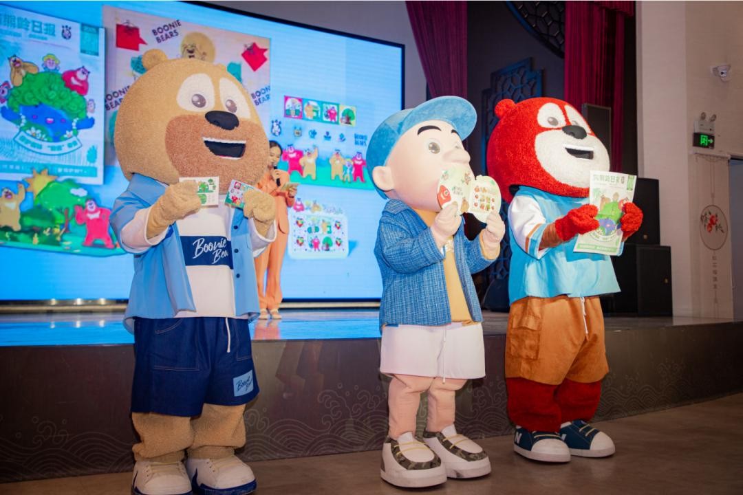6 月1日,在位于盐城九龙口景区的萌熊主题邮局内,中国邮政集团有限公司盐城市分公司举办了熊出没《环保奇遇记》个性化邮票套装首发式。活动主视觉以《熊出没》IP 为核心元素,将熊大、熊二与光头强的憨萌形象与九龙口淮剧元素巧妙融合。活动现场,熊出没三个人偶主角为现场观众展示并介绍熊出没《环保奇遇记》创意邮品套装,不少游客驻足观看、购买。