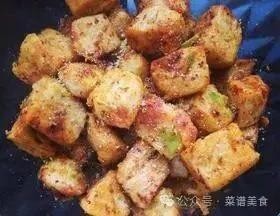3.起锅热油,倒入馒头丁小火慢慢煎至金黄色盛出。