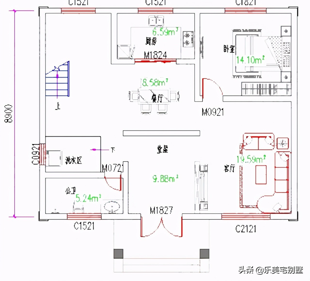 一层:堂屋、客厅、餐厅、厨房、卧室、卫生间、洗衣区
