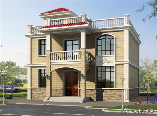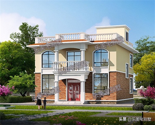 这是一款农村二层平屋顶带露台的欧式小别墅设计图,外立面采用经典的二段式设计,以土橙色仿砖墙搭配淡黄色真石漆,再配以纯白色的檐口、围栏以及罗马柱,整体的效果非常好。