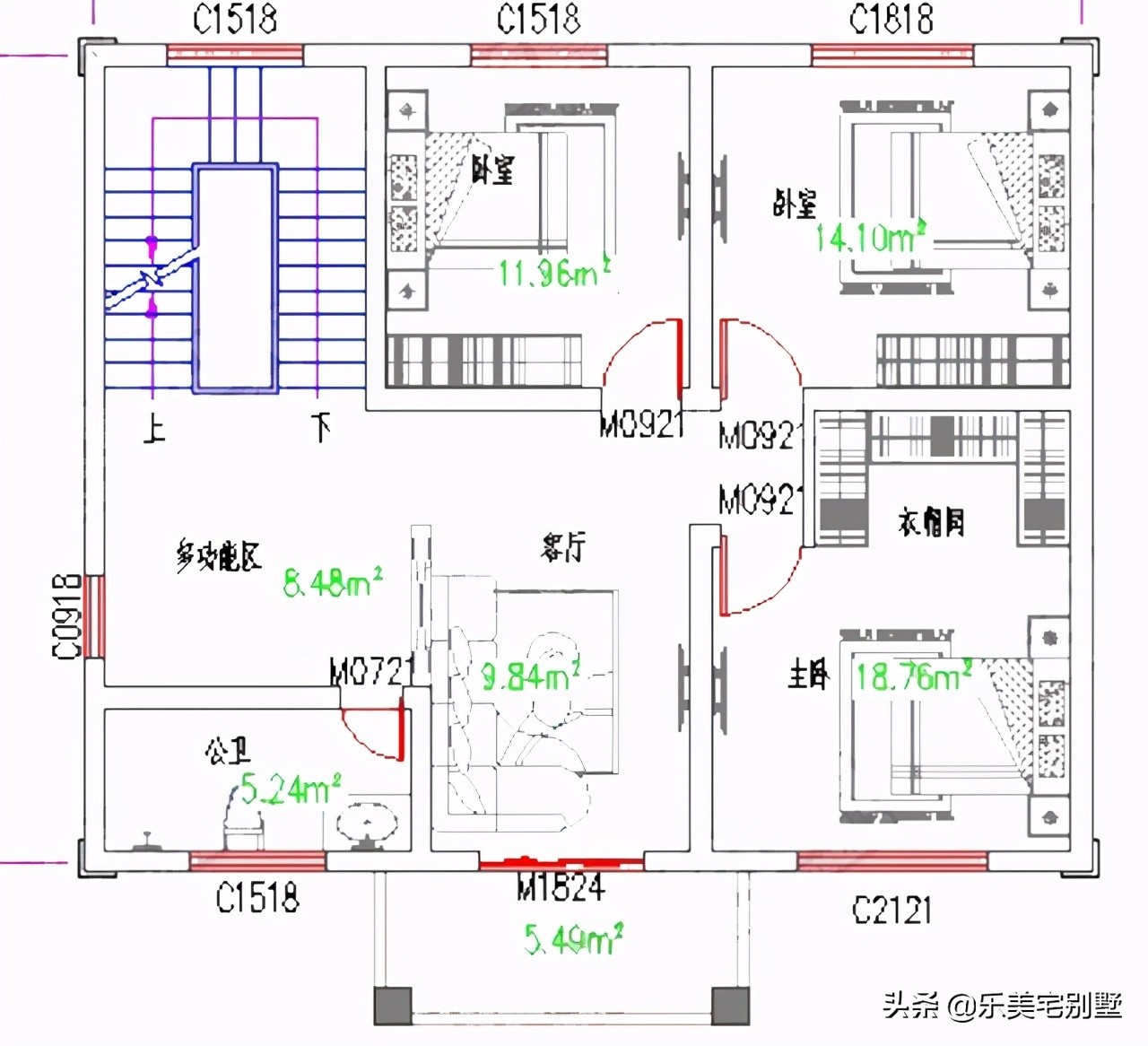 二层:客厅(带阳台)、主卧(带衣帽间)、2次卧、多功能区、卫生间