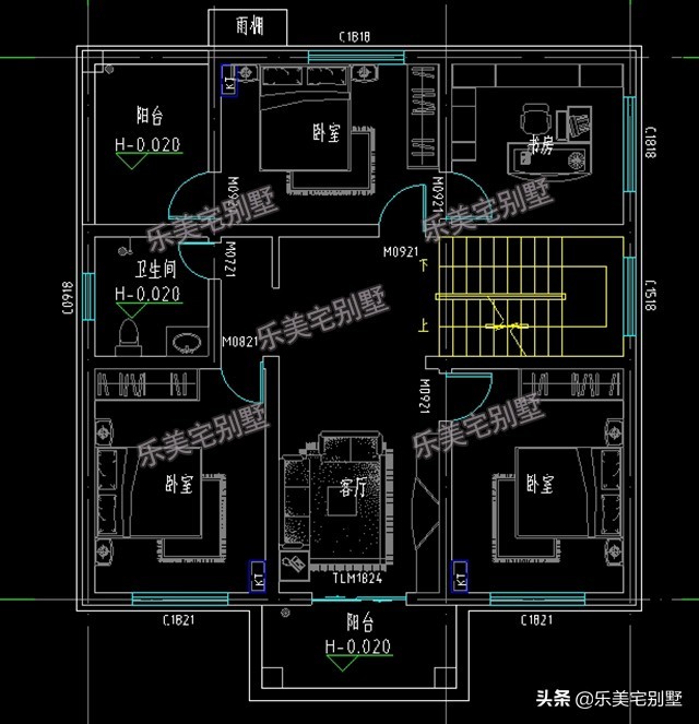 二 层: 客厅(带阳台)、主卧(带阳台、书房)、2次卧、卫生间