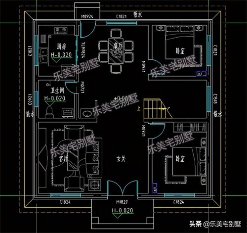 一 层: 玄关、客厅、餐厅、厨房、2卧室、楼梯间、卫生间