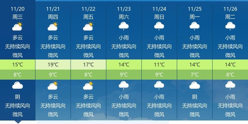 未来三天,宜昌将迎来连续的多云天气,其中21日至22日,天气均为多云,白天最高气温19℃,最低气温9℃,微风。23日则有小雨,白天最高气温14℃,最低气温9℃,微风。请市民朋友随身携带雨具,注意出行安全,特别是23日的小雨天气,路面湿滑,驾车出行请减速慢行,保持车距。