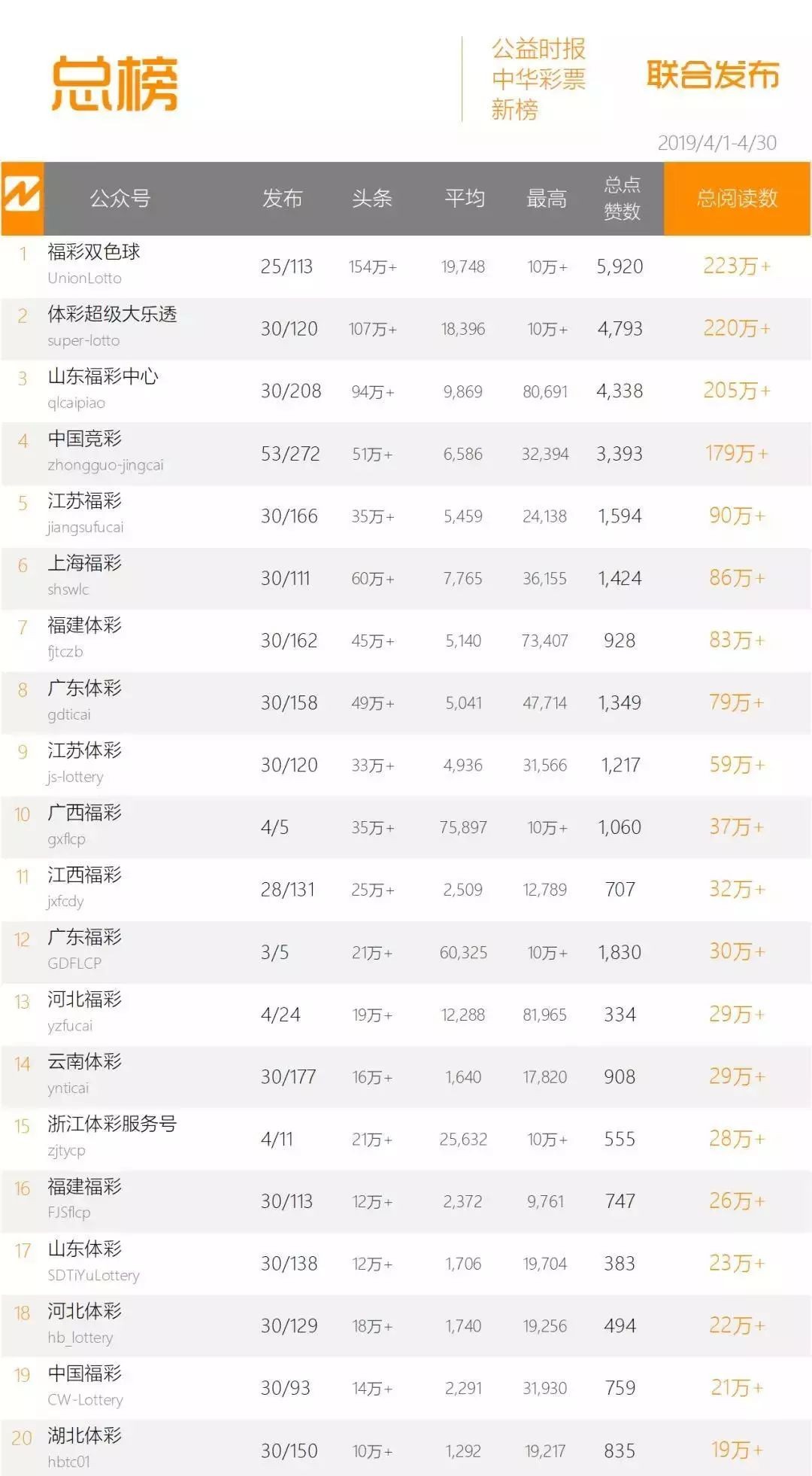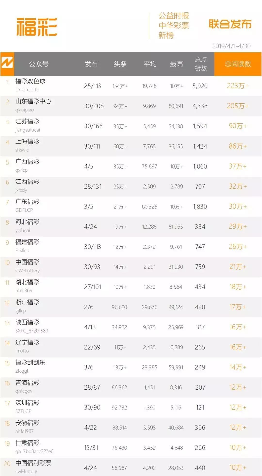 公益时报中华彩票网今日发布“彩票新媒体排行榜”2019年第4期,榜单由各地福、体彩中心服务号和订阅号组成,通过各公众号每月数据生成榜单,本期榜单的监测时间为4月1日-4月30日。