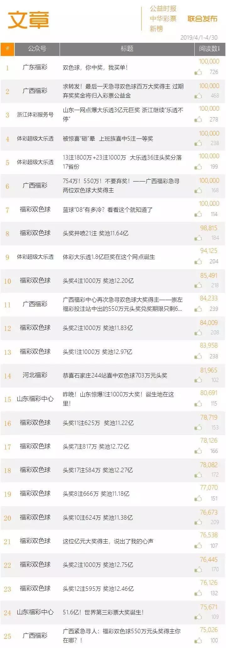 4月份阅读量排行榜中,10万+新闻上榜多达7篇,其中广东福彩1篇、广西福彩2篇、浙江体彩服务号1篇、体彩超级大乐透2篇、福彩双色球1篇。