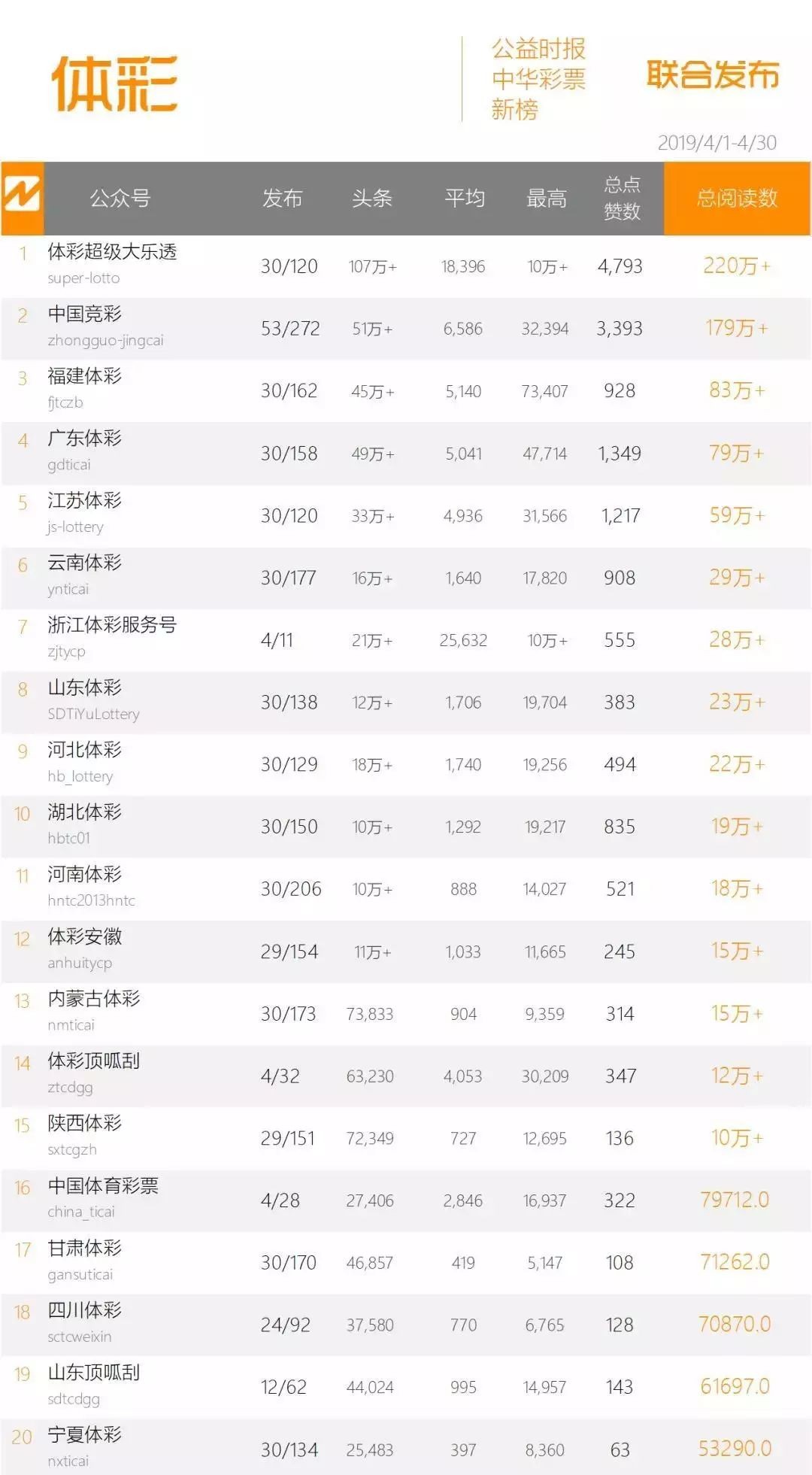 体彩超级大乐透上期总榜排名第一,本期被福彩双色球超越,总阅读数220万次,排名第二。4月份有效发布30天共发文120篇文章,其中头条文章阅读数超过107万次,占总阅读数48.63%。单篇阅读最高的文章获得10万+次阅读。