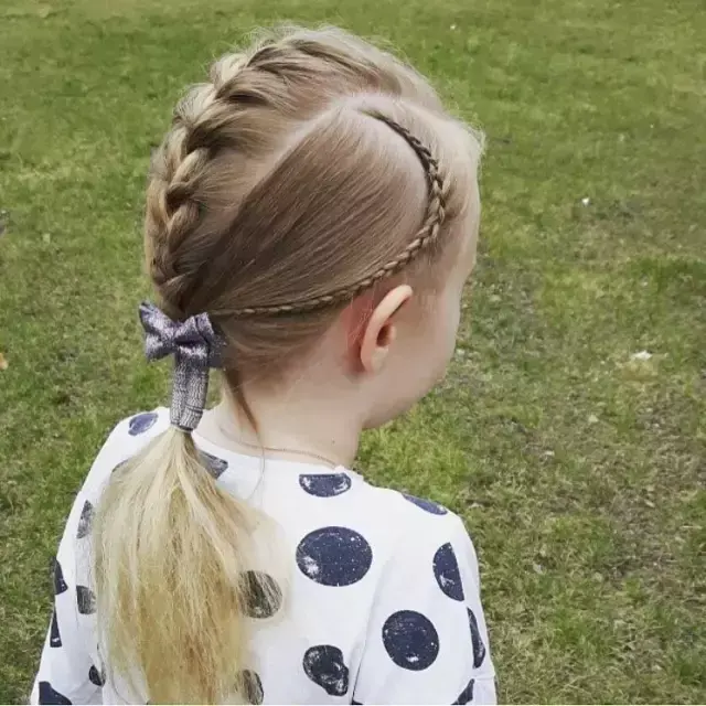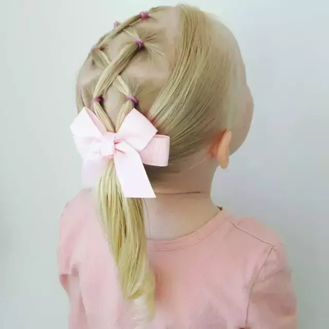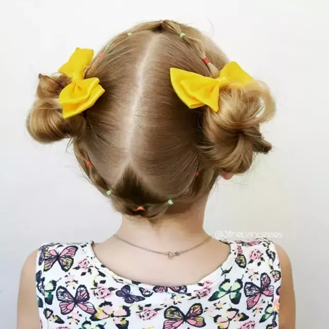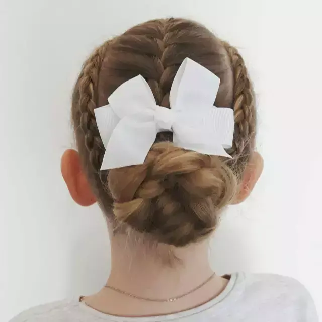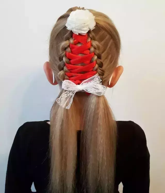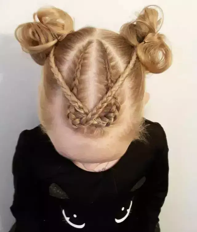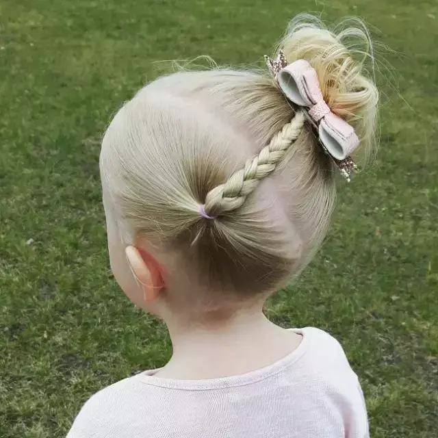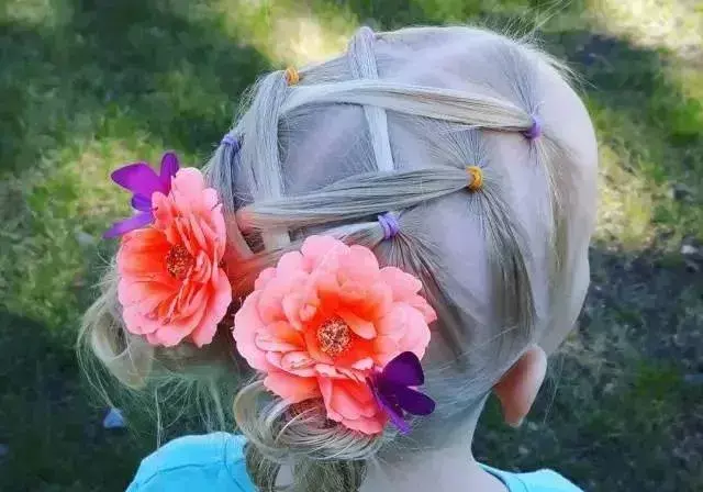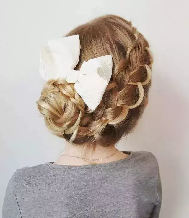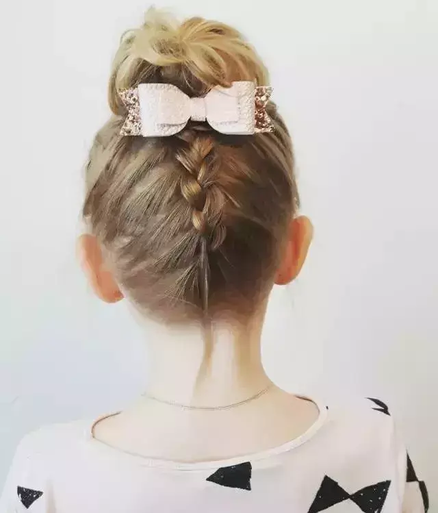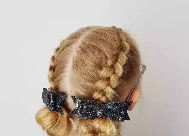 首先,在给宝贝弄出好看的发型前,需要备上粗细橡皮筋各若干条,还有各种好看的蝴蝶结、发带等等发卡和装饰。像是与麻花辫相结合的双丸子头,尽显天真俏皮,再配上两个精致的蝴蝶结发卡,简直美呆了!