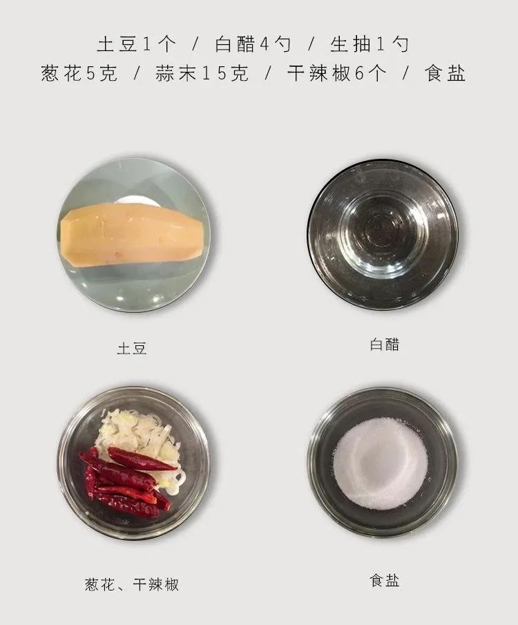 食材清单:土豆1个/白醋4勺/生抽1勺/葱花5克/蒜末15克/干辣椒6个/食盐