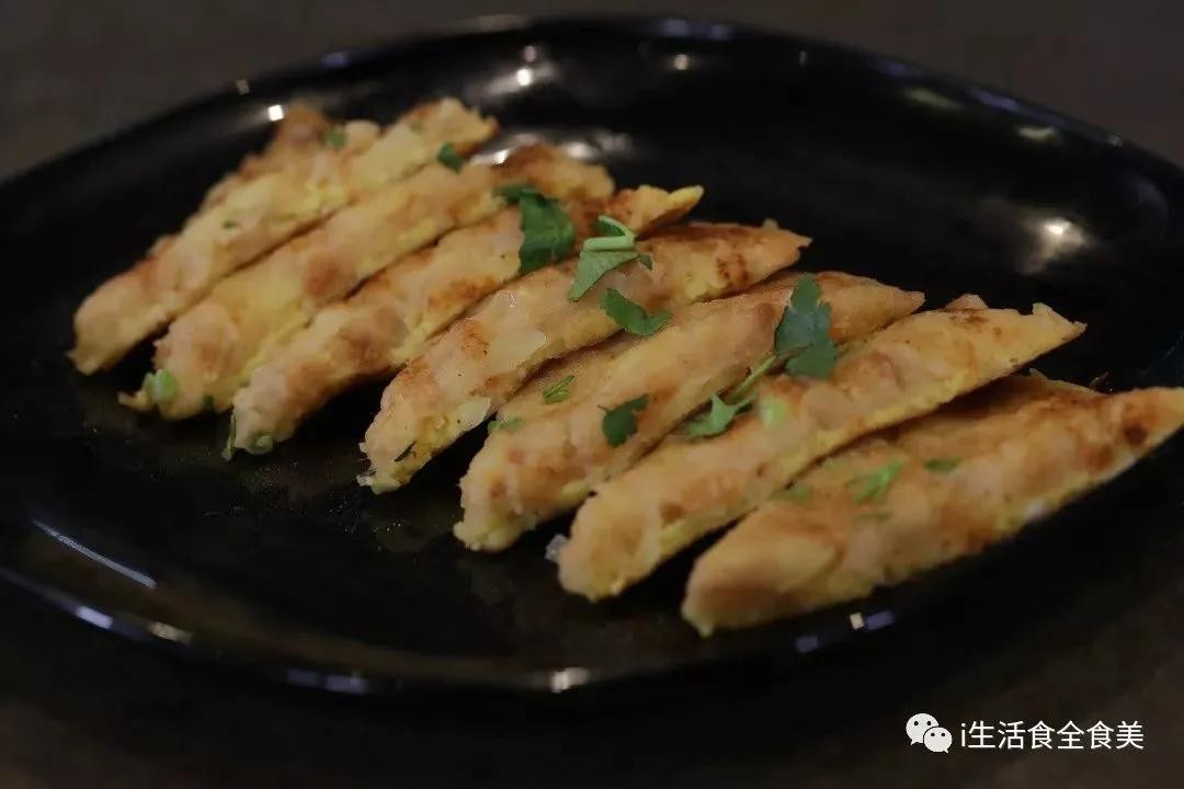 5:炒锅放油下入土豆丝,铺平后煎制微微有点黄,再放入土豆泥铺平煎制两面金黄,装盘香菜叶点缀。