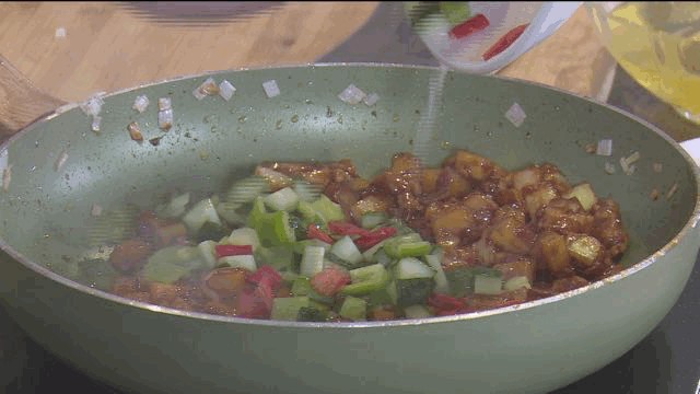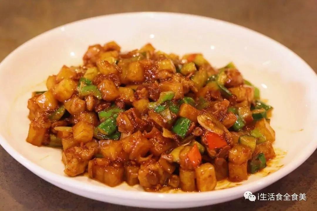 4:炒锅放油下入葱段、姜片、蒜粒、洋葱煸香,下入黄酱、番茄酱、生抽、蚝油,老抽、醋、糖、胡椒粉。放入土豆丁,肉丁,黄瓜丁,青红尖椒丁爆香最后加入水淀粉,香油即可装盘。