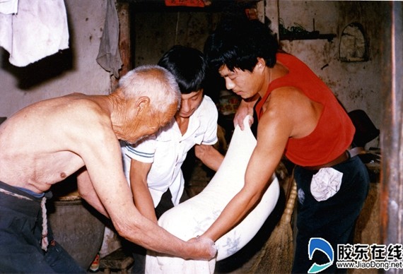 1985年夏天,招远市玲珑镇欧家夼村的共青团员集资为五保老人送面粉。