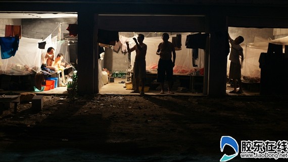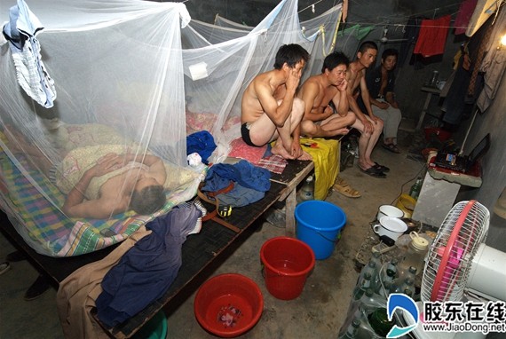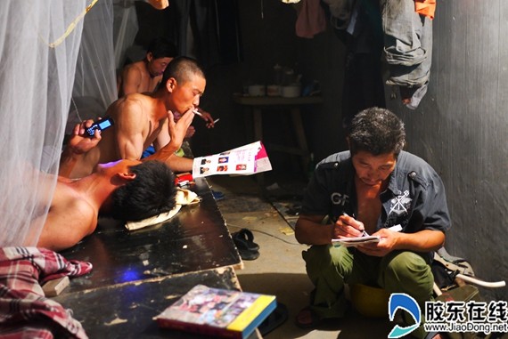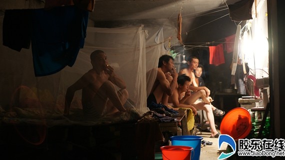 农民工宿舍闷热的夏夜,冲过凉水澡的民工们,围聚在一起观看工友带来的碟片。