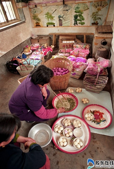 吃大面染红皮鸡蛋。1990年,招远市欧家夼村,一户农家为新生小孩庆生,亲朋前来贺喜都带着篓子装满贺礼,喜主家详细地将贺礼标记好,将染成红色的喜蛋回礼给亲朋。