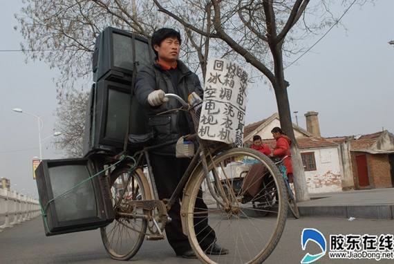 2009年,招远一位收废品的小哥满载已经逐渐淘汰的平面直角电视机回收购站,恍惚间这些平面直角的时尚货又成了废品,不是我不明白这世界变化快,液晶等离子的都快不赶趟了。