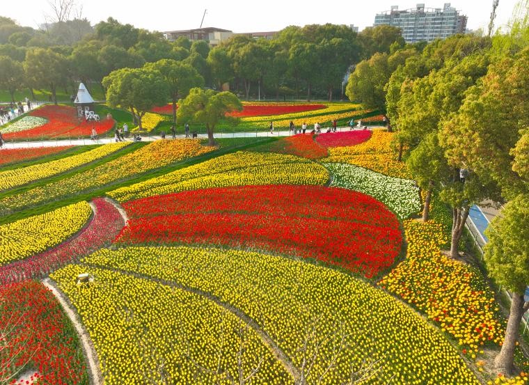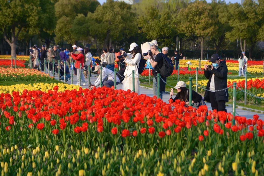 的确,时隔两年,重磅回归,眼下的上海浦西中心城区最大“绿肺”——上海静安大宁公园正是满园多色交织、芬芳馥郁。50万株盈盈舒展的郁金香汇成超10000平方米的花海,方寸镜头里,“花色”正撩人。