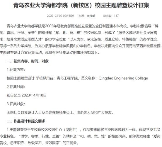 为充分展示学校精神风貌和办学特色,青岛农业大学海都学院官网日前发布了青岛农业大学海都学院(新校区)校园主题雕塑设计征集活动,面向公众开展青岛莱西新校区校园主题雕塑设计方案征集活动。从活动中可以看到,学校的名称基本已确定为“青岛工程学院”。应当说,这个名称起的还是很有水平的,相信对于学院的发展会起到很大的助推作用。