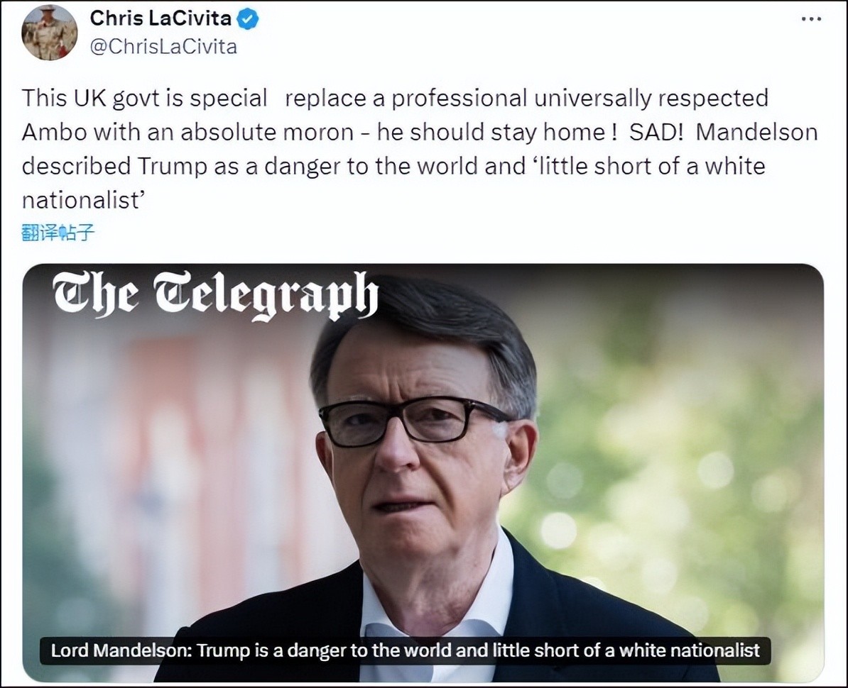 不过斯塔默政府改善中英关系的想法,并没有得到美国的支持,尤其是即使上台的特朗普团队对斯塔默政府是相当的不满。比如最近特朗普团队的顾问就公开大骂斯塔默政府任命的英国驻美大使曼德尔森。因为这位曼德尔森曾批公开评特朗普“是一个恶霸、白人民族主义者、对世界构成威胁的人”。虽说美国向来都有所谓的“言论自由”,但是这种“言论自由”并不适用于所有场景。比如美国人从来都不敢公开调侃犹太人,否则分分钟就要被“物理清除”。也正因此,斯塔默政府任命曾公开辱骂特朗普的曼德尔森为英国驻美大使,无疑是在打特朗普的脸。