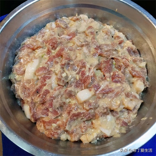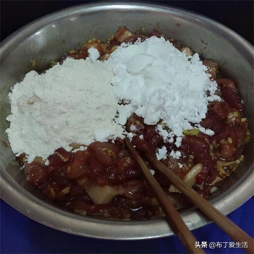 ③接着加两勺生抽、一勺酱油、小半勺食盐(生抽调味,酱油上色)搅拌均匀,让猪肉都能充分上色入味。抓小把面粉和土豆淀粉,再次搅匀,如果觉得有点干,可以加适量温水或食用油调和一下。用湿面巾盖住,腌制10分钟。