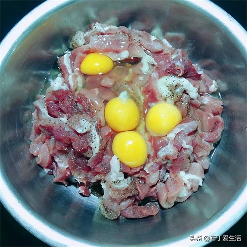 ②将切好的肉条倒入大一点的碗中,加一勺黑胡椒,这个可比料酒的去腥效果好很多。打入四个鸡蛋,加入适量姜葱蒜末。沿着一个方向搅拌多次,大概搅拌5分钟,让猪肉充分上劲。