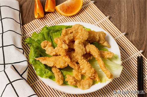 ②肉条不可切得过细。一般要保证有半公分的厚度(筷子粗细就差不多)。切得太薄,炸的时候肉质回缩较快,容易炸透炸焦。