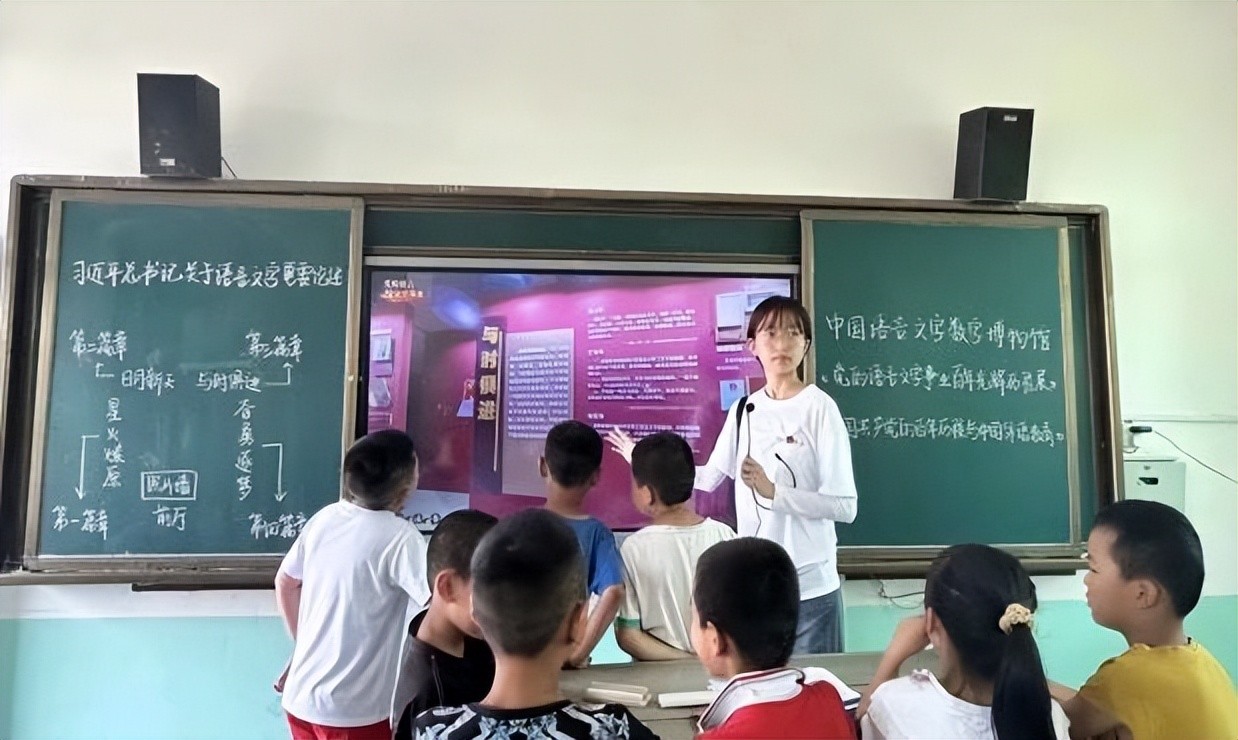 “What is this letter?”“It is letter A.”伴随着师生互动,生动有趣的字母操更好地激发了小学生学习英语的兴趣。远古的甲骨上,刻着古人的故事,实践团队给孩子们教学的甲骨文望见生命的力量之和,符号成了诗,呼唤成了歌。启动大脑,拓展思维,在思维拓展图画课上,雪王、地球、向日葵......孩子们脑洞大开,开拓思维疆域。VR语言文化博物馆,奉上云端“文化盛宴”,在5G技术和VR技术的结合中,孩子们学语言国情,入语博学堂,咏经典传承。