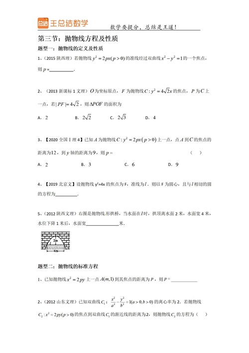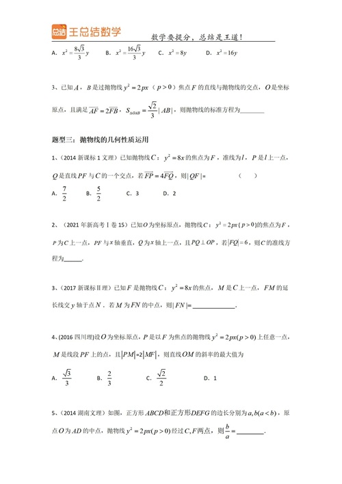 题型一:抛物线的定义及性质;题型二:抛物线的标准方程