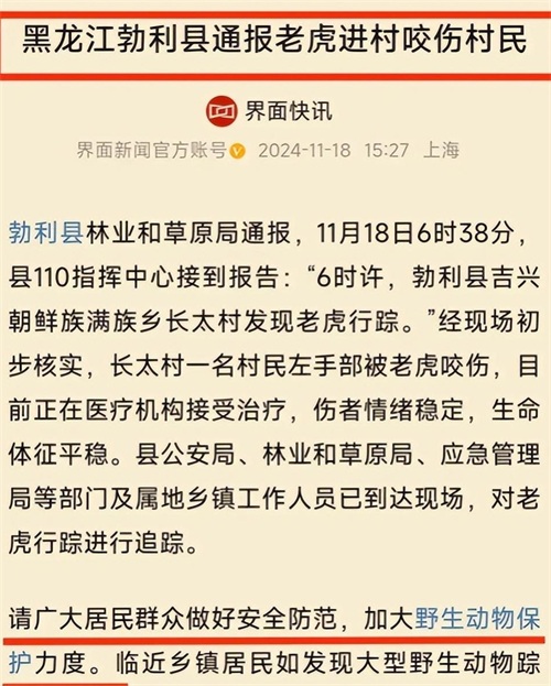在黑龙江勃利县发生的这起令人震惊的老虎伤人事件中,一名年迈村民赵大爷在喂牛时不幸被老虎咬伤,所幸经过及时手术保住了胳膊。而另一位村民张大爷凭借机智与多年的兵员经验,成功逃脱了老虎的攻击。这一事件迅速引发了社会各界的广泛关注,网友们的讨论焦点不仅集中在老虎为何下山,还涉及到伤人事件的处理、政府的应对措施以及人类与野生动物共存的复杂关系。