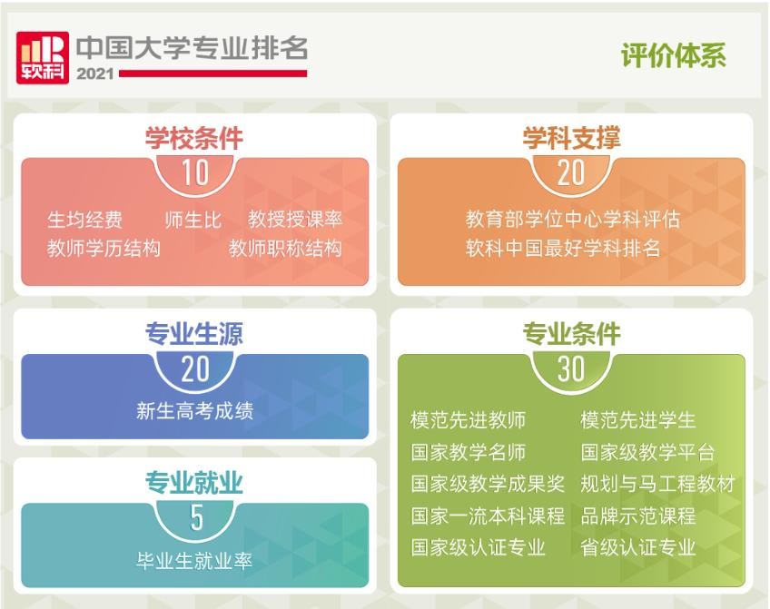 “软科中国大学专业排名”是迄今为止覆盖专业数量最多、参评专业规模最大的中国大学本科专业排名。每个专业榜单发布的是所有开设该专业的高校中排名位列前50%的高校,共有925所高校的28550个专业上榜。排名指标体系设置学校条件、学科支撑、专业生源、专业就业、专业条件5个指标类别,共19项测量指标。以全国排名前2%或前2名作为A+专业的标准。