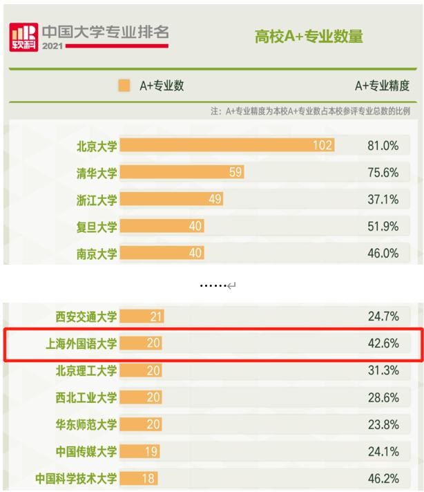 6月22日,软科正式发布2021“软科中国大学专业排名”。上海外国语大学表现出色,共有46个专业上榜,包括20个A+专业数。在此次排名中,上外A+专业数位列全国第20名。